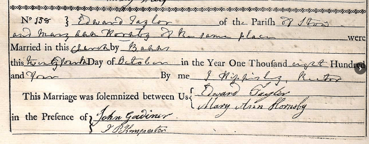 Eventually, looking further afield, I found Edward Taylor in Stepney, of all places, Hornsby2staying with a previously unknown sister who was born in Stow (or Stow-on-the-Wold) in Gloucestershire. The birthplace, age, and occupation for Edward matched, so I knew it had to be correct. (Incidentally, I still don’t know who Harriet is.) Once I had narrowed down the likely parish of marriage, the rest Hornsby3was relatively easy. Lo, and behold, the marriage between Edward Taylor’s parents. And the marriage entry even has their signatures!