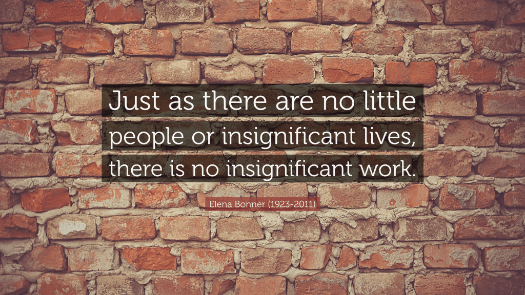 In life, all people are important, regardless of the role they may play. Teamwork requires all to pull their weight if the team is to be successful. Take almost any sports team. All are significant, from the players and the coaches to the owners and office staff; from those who keep the stadium clean and ready for use to those who wash the uniforms; and from those who clean up after a game to the driver of the team bus. To be effective and efficient, the team needs all of those people, and needs them to work together. So there really is no insignificant work. Ultimately, we are all on the same side.