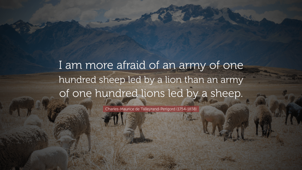 This is an interesting one, and has seen several different forms and authors, possibly as far back as Alexander the Great. But let’s give Talleyrand the benefit of the doubt for now. Those Talleyrand served often distrusted him, and his name has become a byword for crafty, cynical diplomacy. So, is he using misdirection here? Maybe he was alluding to the British soldiers as lions, and their generals as sheep, although I have also heard the phrase lions led by donkeys. I think the point here, though, is that strong soldiers led by a weak leader are less to be feared than weak soldiers led by a strong leader. It is the strength of the leadership that really matters.