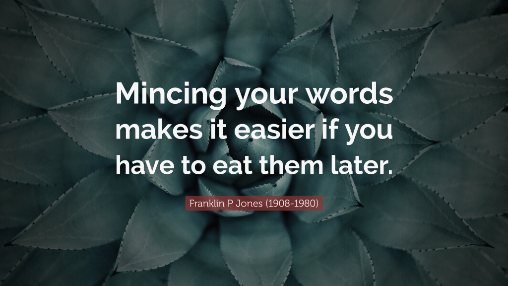 This is one of many witty and amusing quotes from this author. I’ve always known that mincing my words means that I am speaking vaguely, or indirectly. The phrase is more commonly used in a negative context, as in not mincing one’s words so that you are speaking directly, and don’t care if the person being addressed will be offended. As for eating one’s words, this is having to admit you were wrong about something you have said in the past, so this is an amusing conjunction of the two phrases.