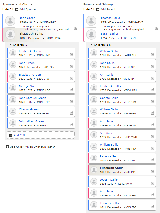 It seems logical to think that the Norfolk, Hertfordshire, Middlesex, and Yorkshire births are all to separate families. Which then leaves me looking at the Gloucestershire births since my interest in the family is because Elizabeth Sallis is my 3rd-great grandmother.