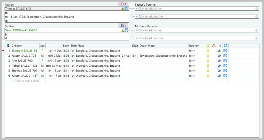 Of course, I still have work to do to tidy this all up. I am still looking at the christening of Robert Sallis as this took place just 8 months before that of Thomas, which also calls into question whether the Joseph in 1814 (also christened in Alderton) belongs. Additionally, I have to separate out the Beckford births from the FamilySearch family, and leave a polite note there explaining what I am doing. After all, being kind is probably the best way of teaching others, and is also the way I would like to be treated if/when I make an error.
